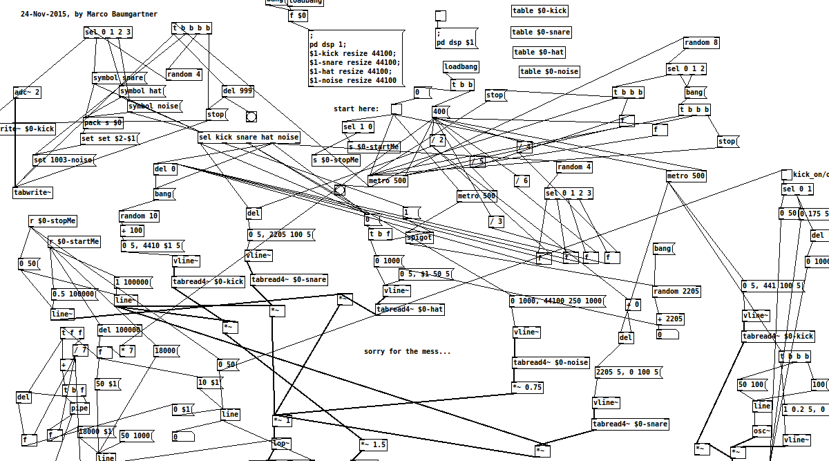 The patches are extremely messy. All made in a hurry. Make sure to open the patches with muted speakers/headphones, as some of the patches are just firing off... They aren't documented in any way - it's pure mess with pure data.